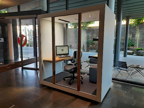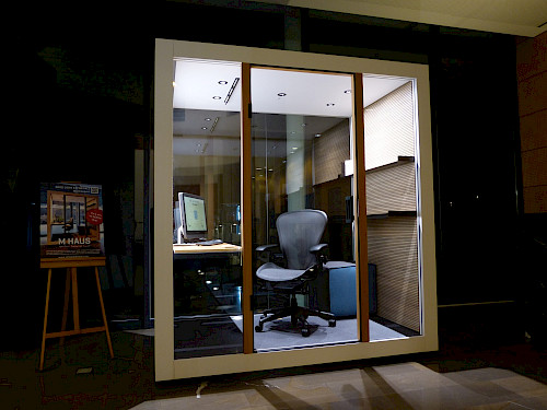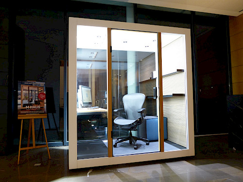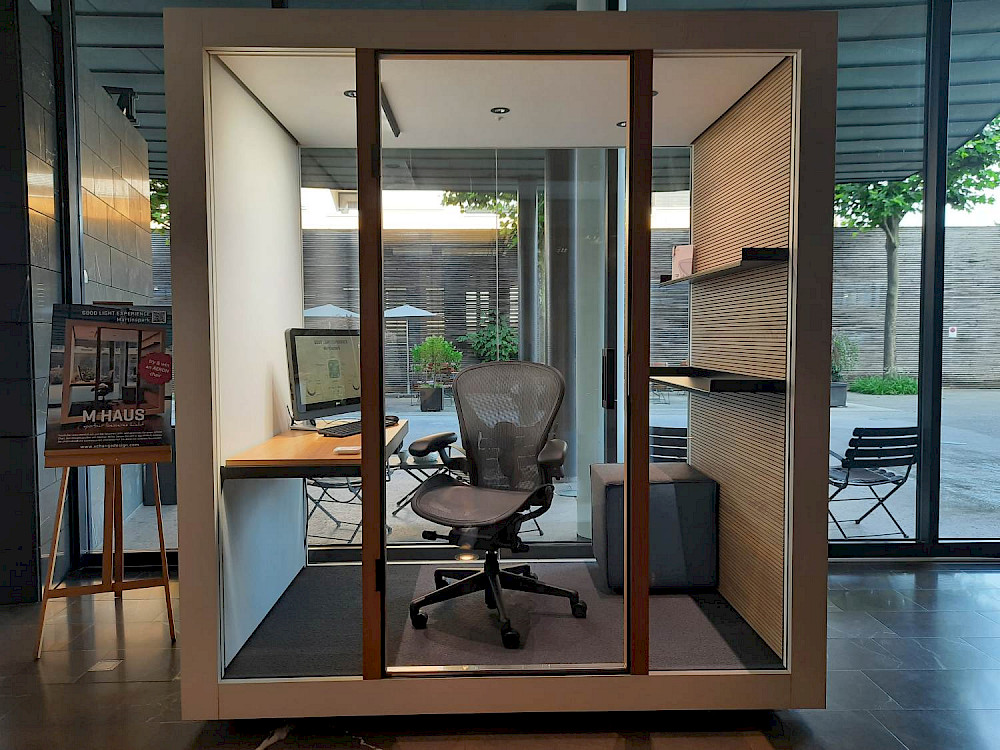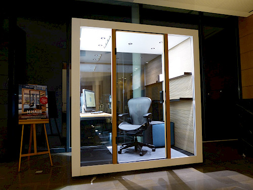 In diesen Rahmen fügt sich unser M Haus im Lobbybereich perfekt ein. Für einen ausgewählten Zeitraum haben alle Gäste im Martinspark die Möglichkeit unsere Raum-in-Raum-Lösung zu erleben. Dabei spielen alle multifunktionalen Vorteile, wie Licht und Akustik, eine entscheidende Rolle. Damit können Gäste kurzerhand ein diskretes Telefonat führen oder konzentriert am eigenen Laptop arbeiten.